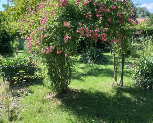 Rosną drzewa owocowe obficie owocujące : jabłoń , brzoskwinie , paragwaj , krzewy : maliny, agrest, porzeczki czerwone i czarne, winogrona oraz rośliny ozdobne