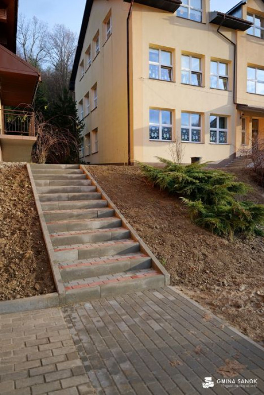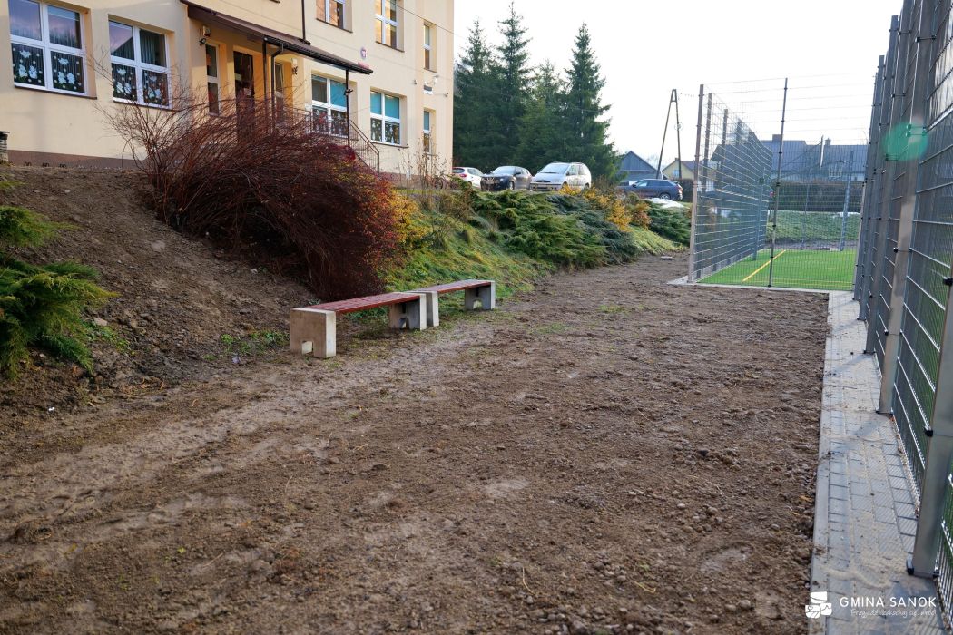 Prace objęły także remont ogrodzenia boiska – dokonano częściowej wymiany paneli, uzupełniono mocowania i punktowo odmalowano elementy konstrukcyjne. Dodatkowo odnowiono ciągi piesze – część nawierzchni z kostki brukowej została przełożona, a pozostała oczyszczona.