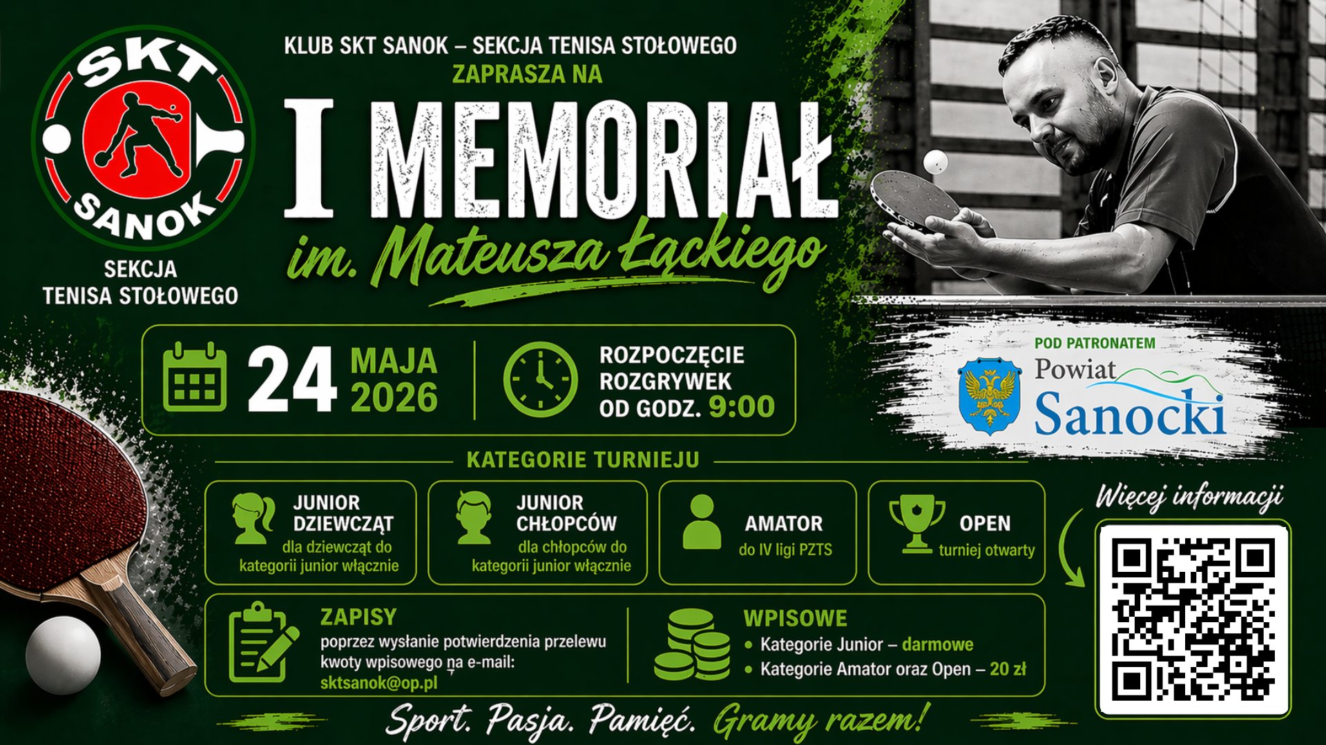 Sekcja tenisa stołowego klubu SKT Sanok zaprasza na wyjątkowe wydarzenie sportowe. 24 maja w hali I Liceum Ogólnokształcącego odbędzie się I Memoriał im. Mateusza Łąckiego. To turniej, który łączy sportową rywalizację z pamięcią o człowieku, który przez lata aktywnie wspierał rozwój sanockiego tenisa stołowego.